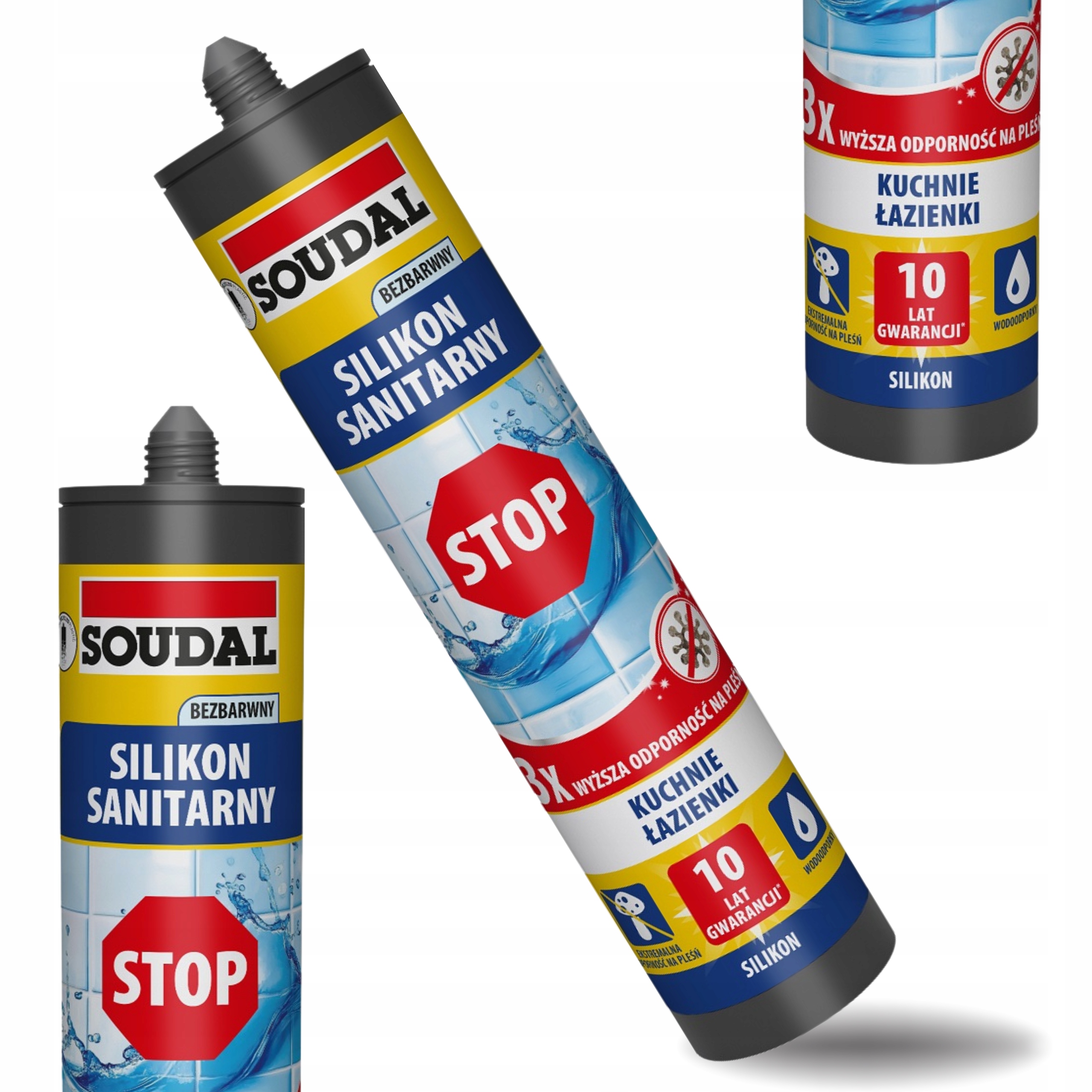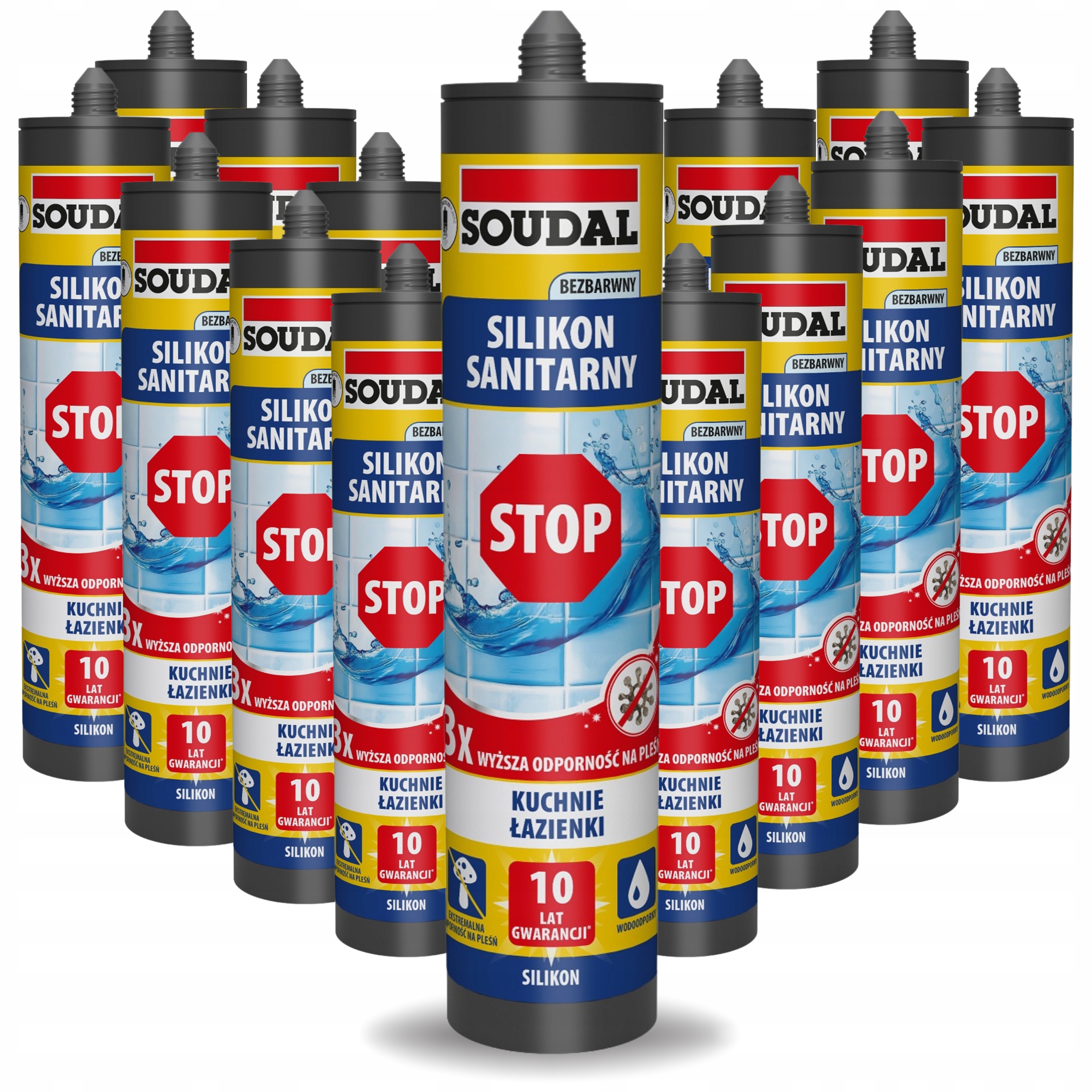15x Silikon sanitarny SOUDAL STOP bezbarwny 280 ml – grzybobójczy, super mocny uszczelniacz