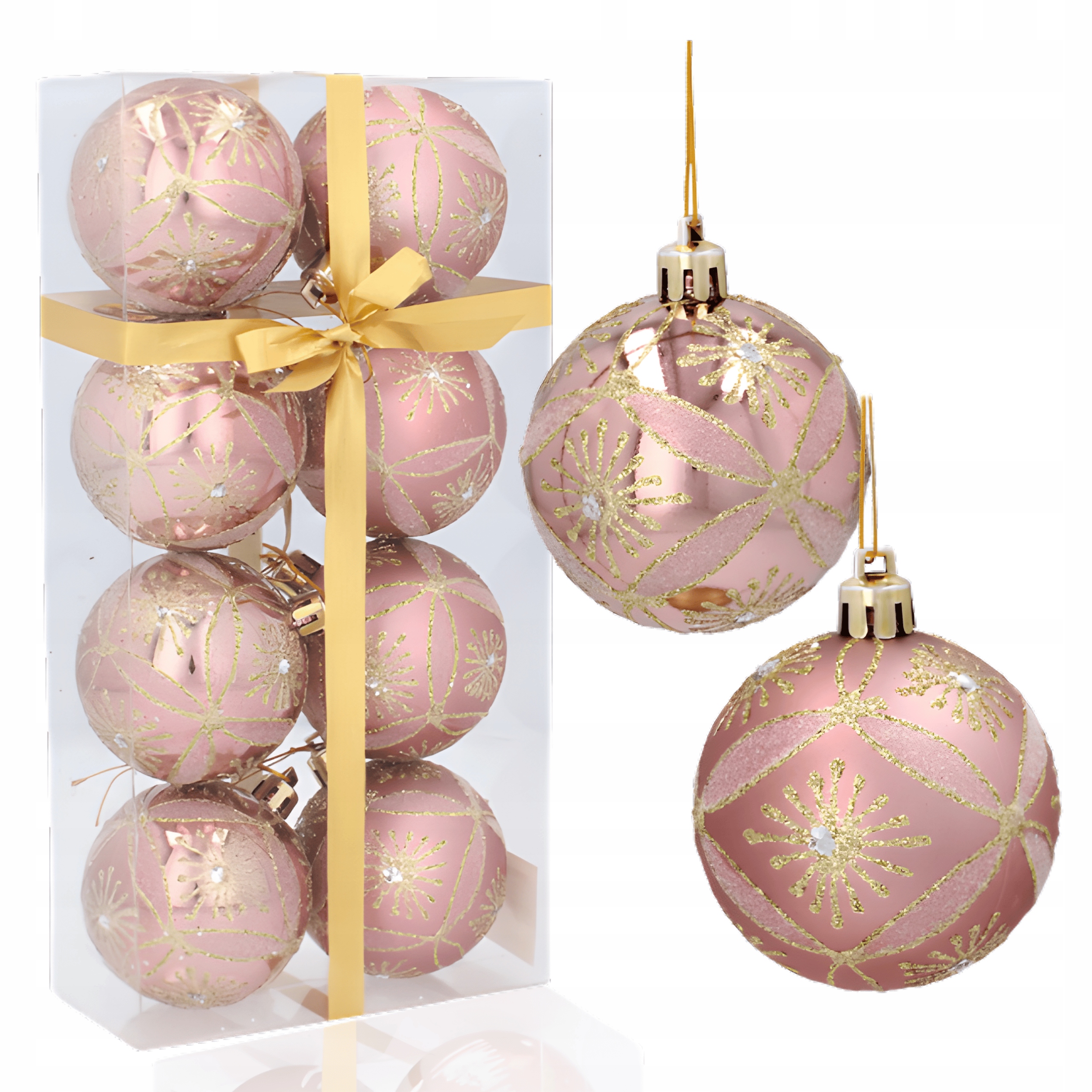 Nasze różowe bombki choinkowe to idealny sposób, by nadać Twojemu drzewku subtelnego uroku i wyjątkowego stylu. W zestawie znajduje się 8 bombek o średnicy 6 cm, w dwóch wykończeniach – 4 matowe i 4 błyszczące, co tworzy piękny kontrast i elegancki efekt wizualny.
