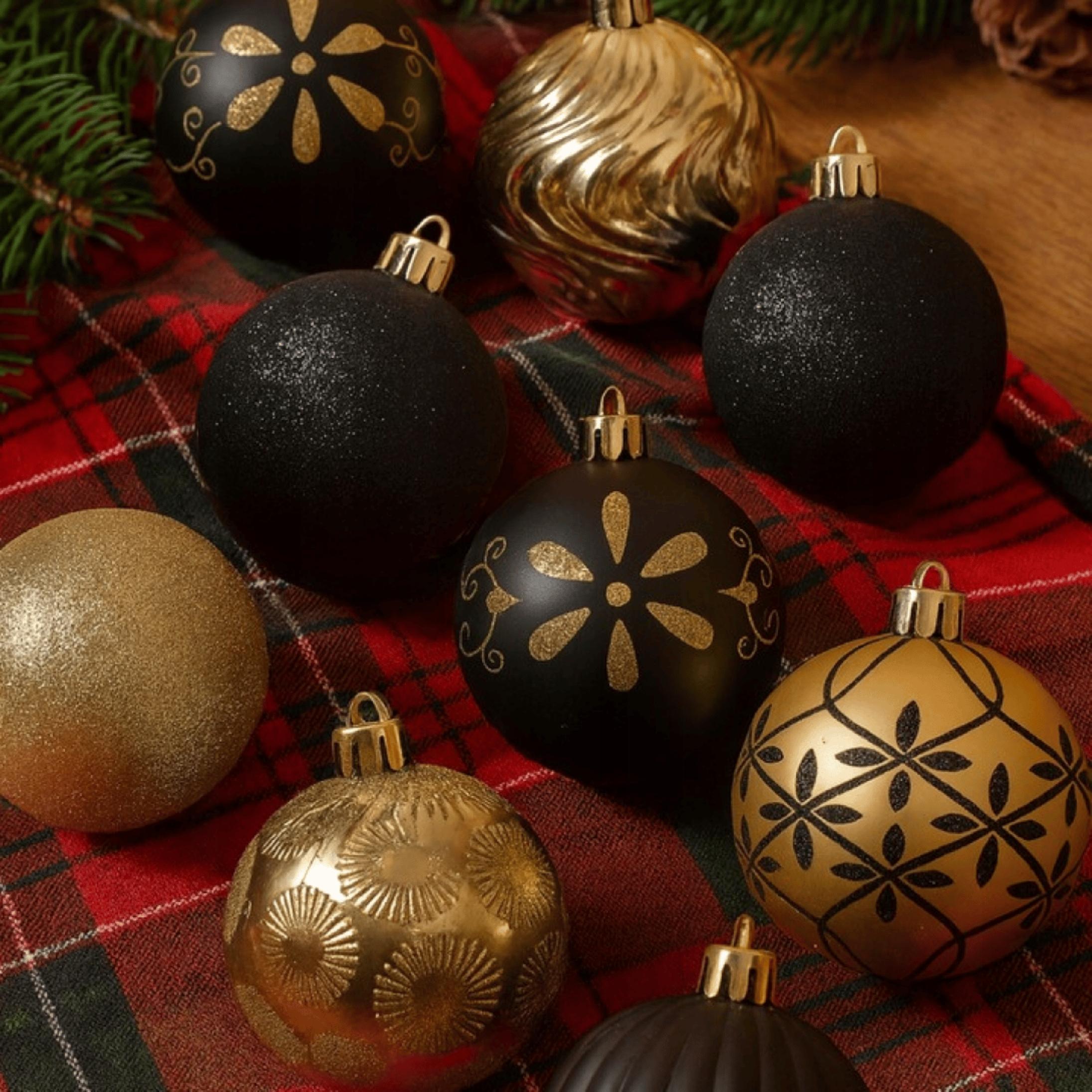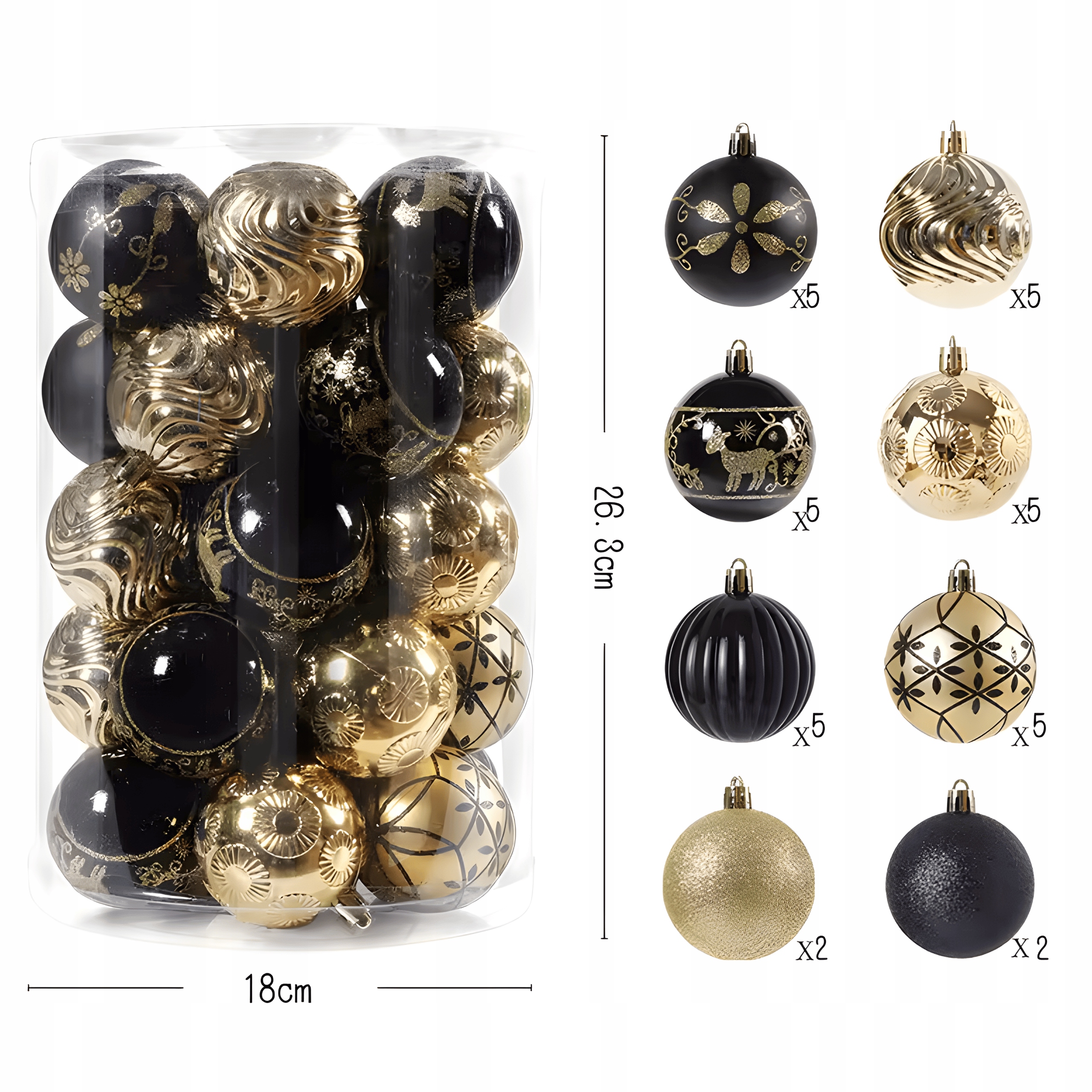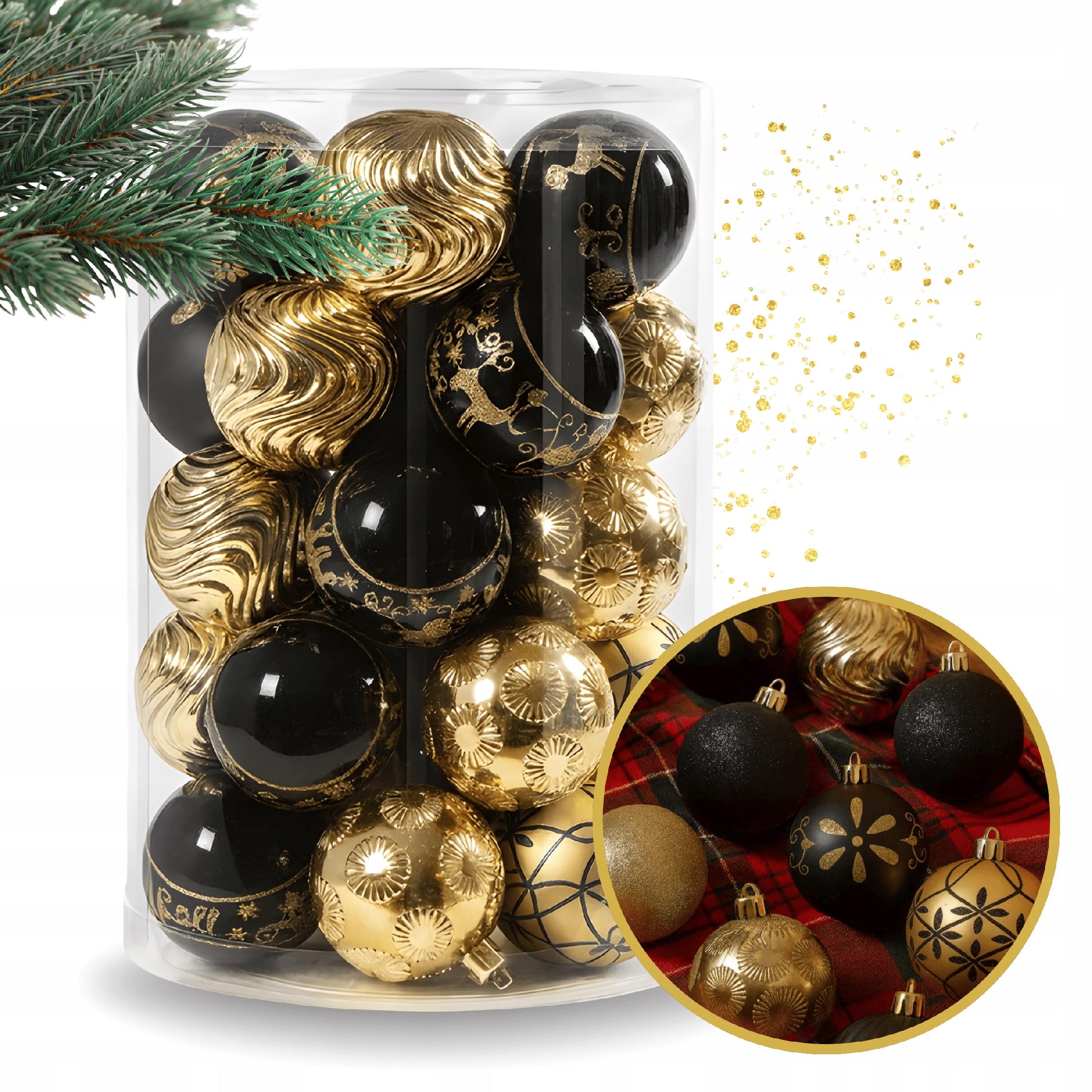 Zestaw 30 bombek w kolorystyce czarno-złotej to doskonały wybór dla miłośników stylowych, nowoczesnych dekoracji świątecznych.