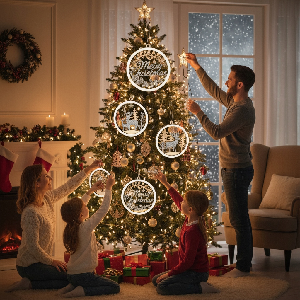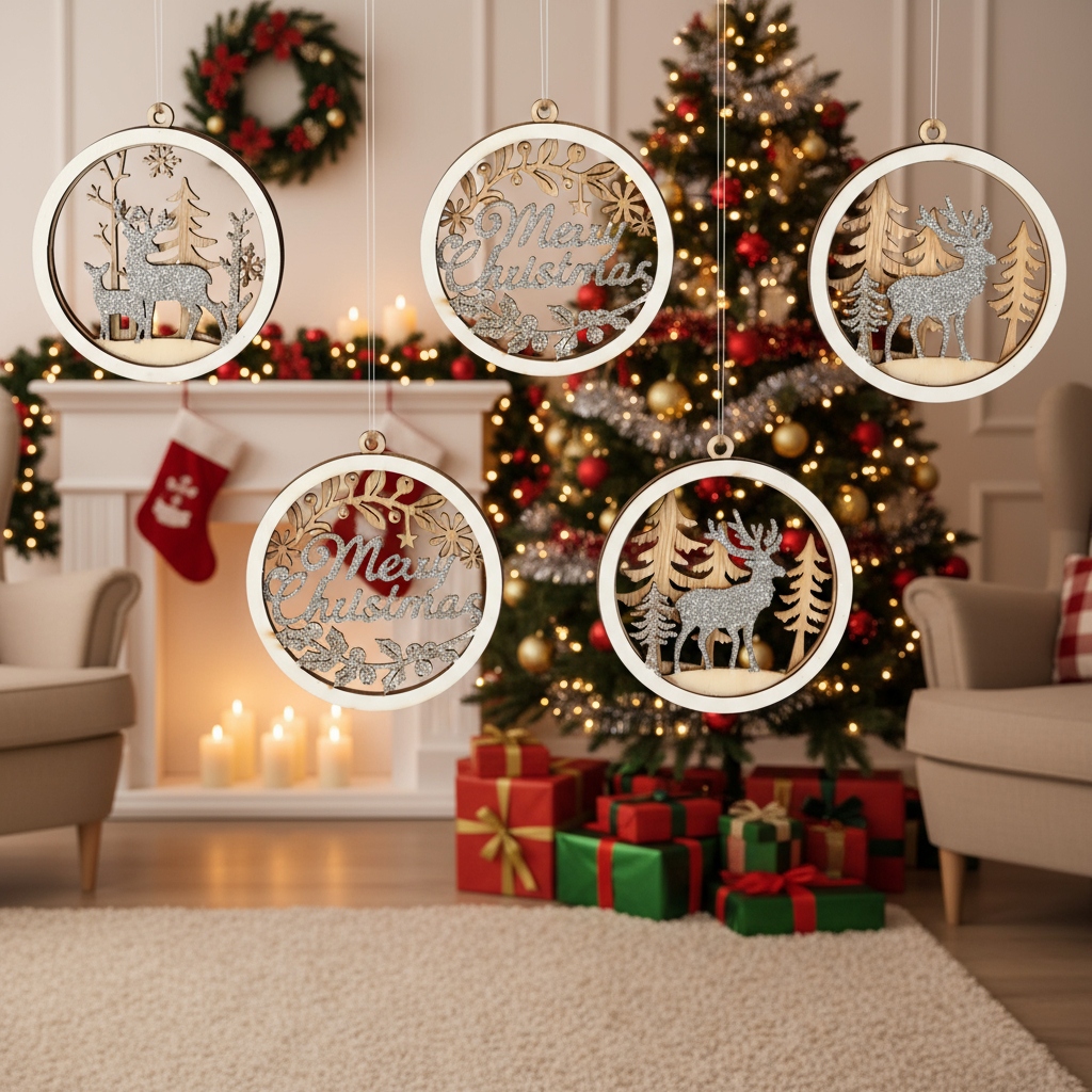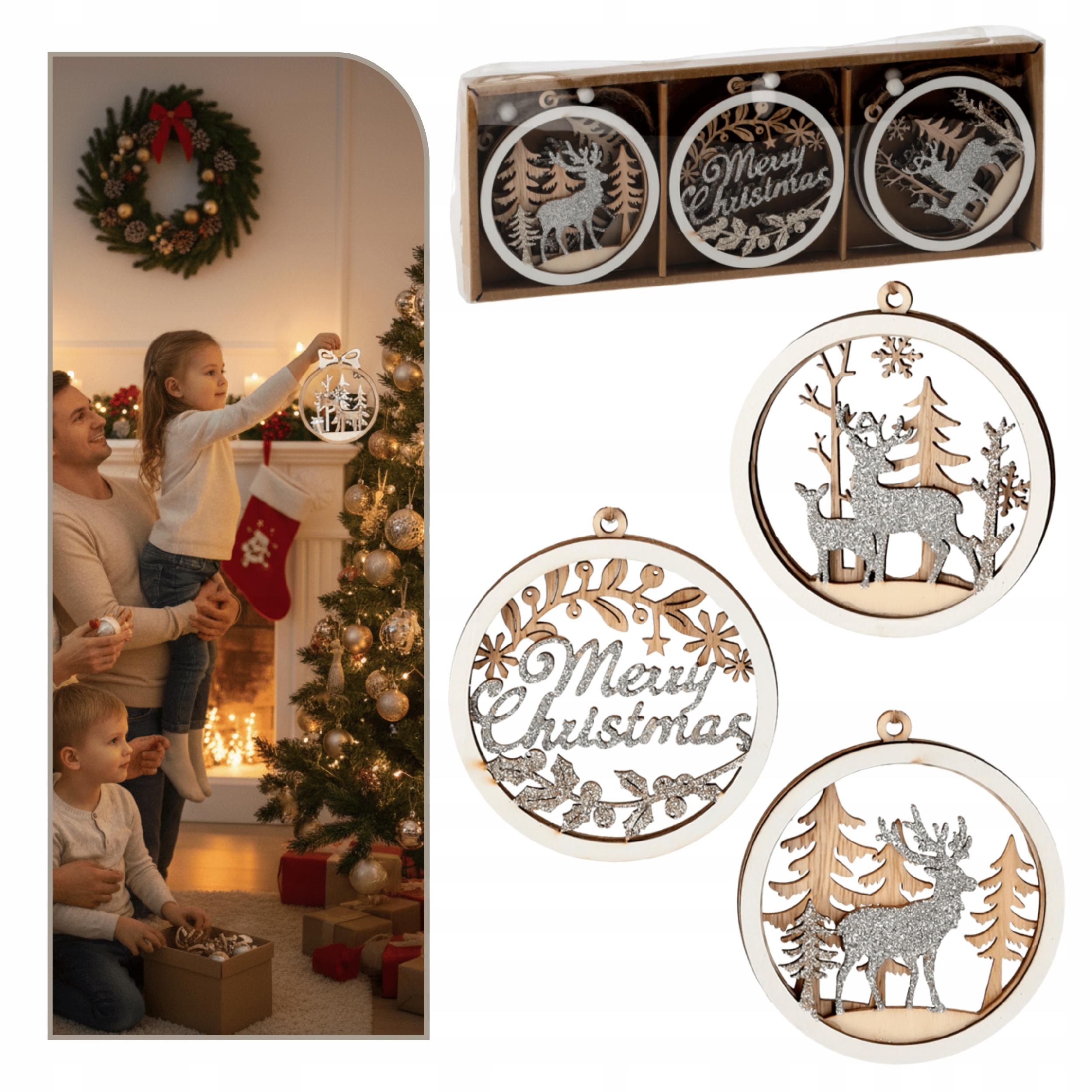 Zestaw 6 drewnianych ozdób choinkowych to idealny wybór dla miłośników tradycyjnych, klimatycznych dekoracji świątecznych. Każda zawieszka ma starannie wycięty wzór – renifery, choinki i napisy „Merry Christmas” – ozdobione delikatnym brokatem, który pięknie odbija światło lampek choinkowych.
