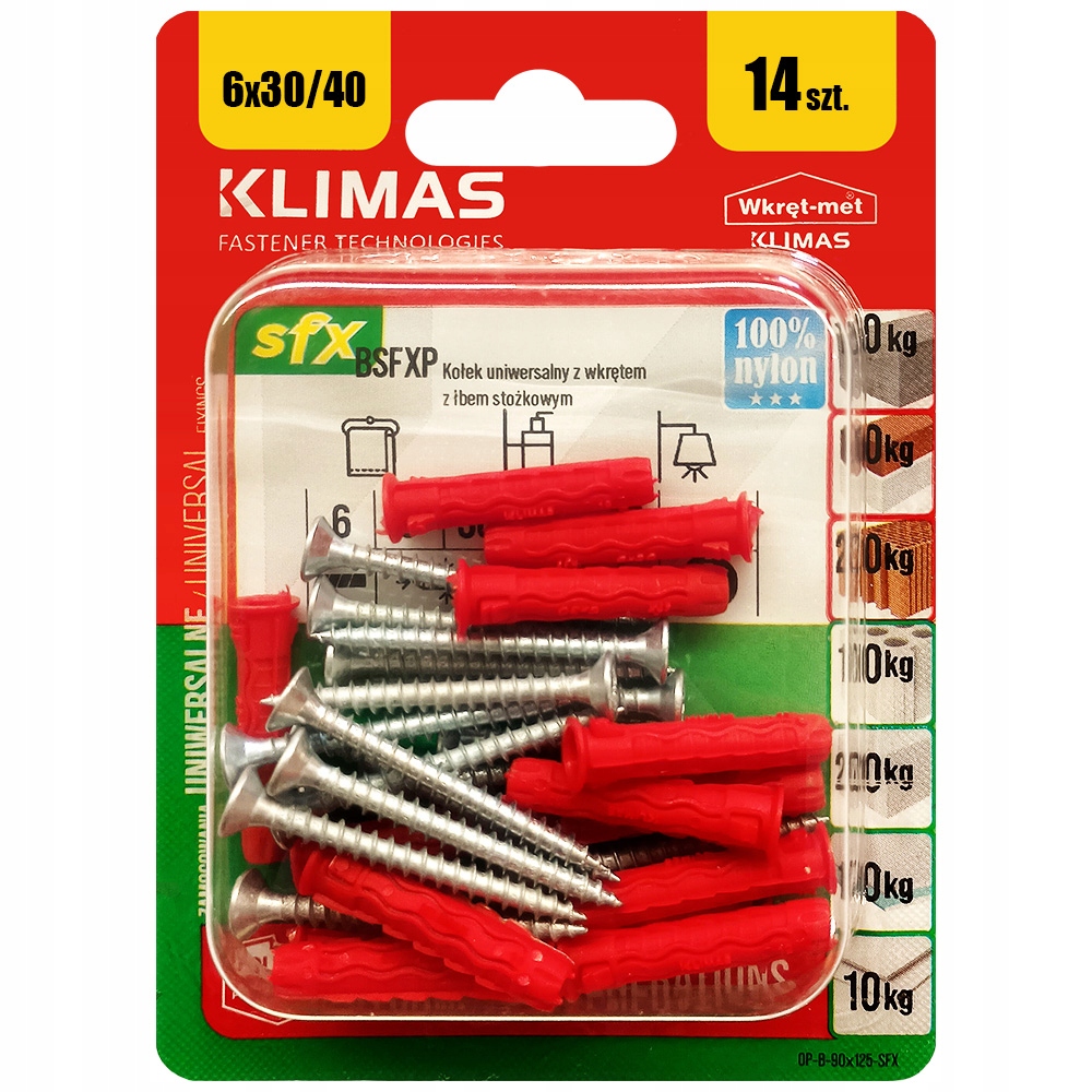 KOŁKI UNIWERSALNE 6x40 Z ŁBEM STOŻKOWYM PZ2 BLISTER 14szt KLIMAS