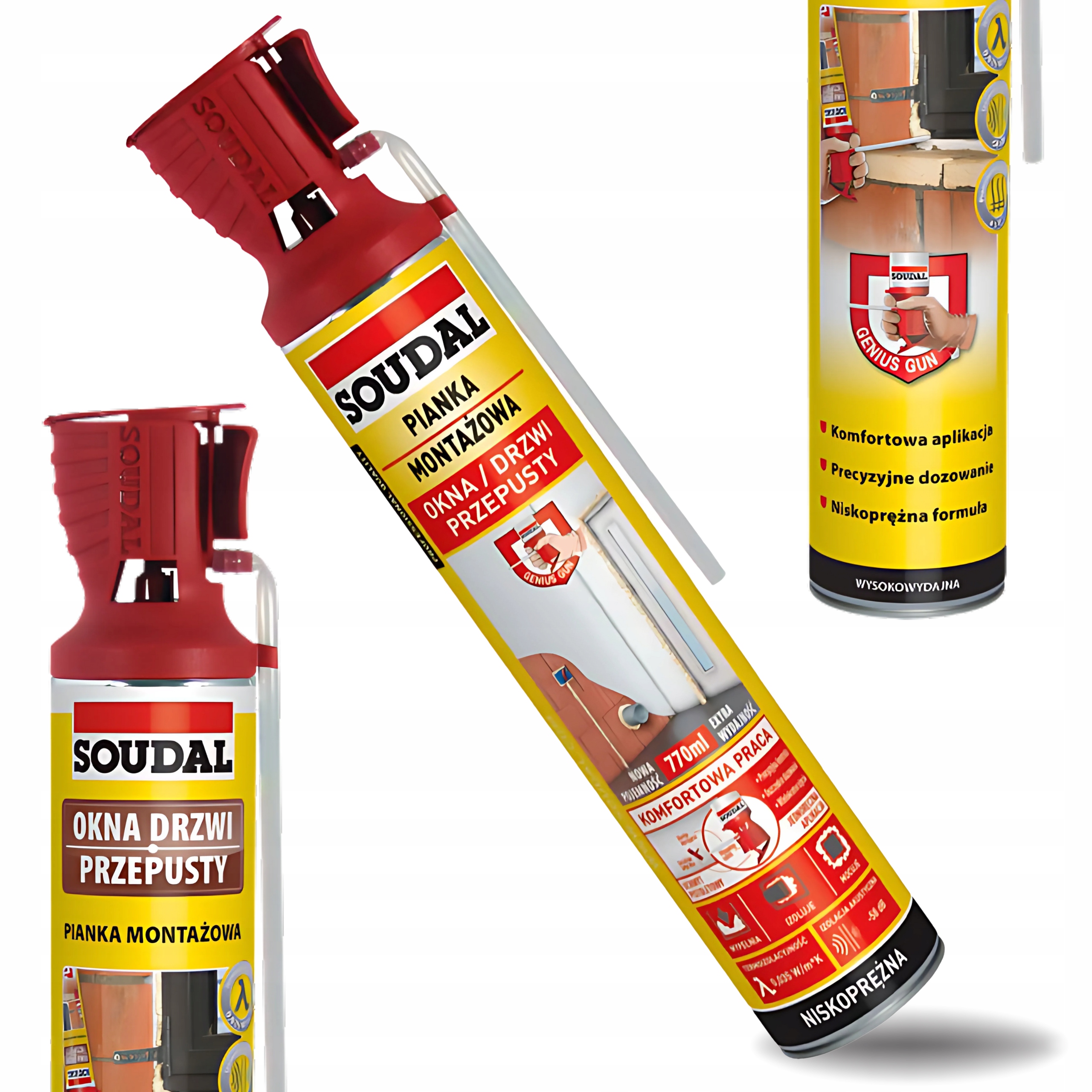 Soudal Genius Gun 770 ml – profesjonalna pianka montażowa z wygodnym aplikatorem, dzięki której prace montażowe i uszczelniające stają się szybsze, czystsze i bardziej precyzyjne.