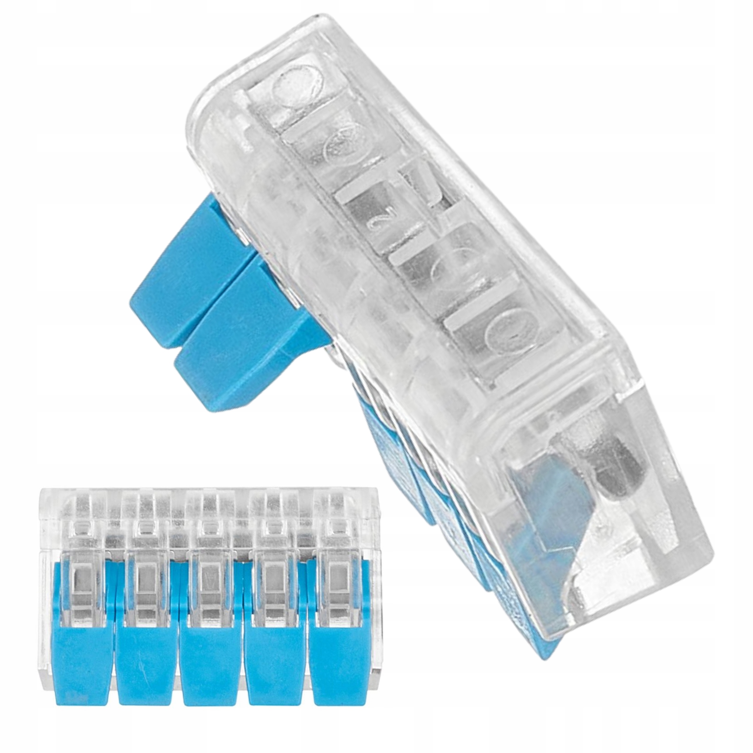 - Ilość połączeń: Złączka umożliwia łączenie aż pięciu przewodów jednocześnie, co pozwala na oszczędność miejsca oraz czasu podczas wykonywania instalacji.
