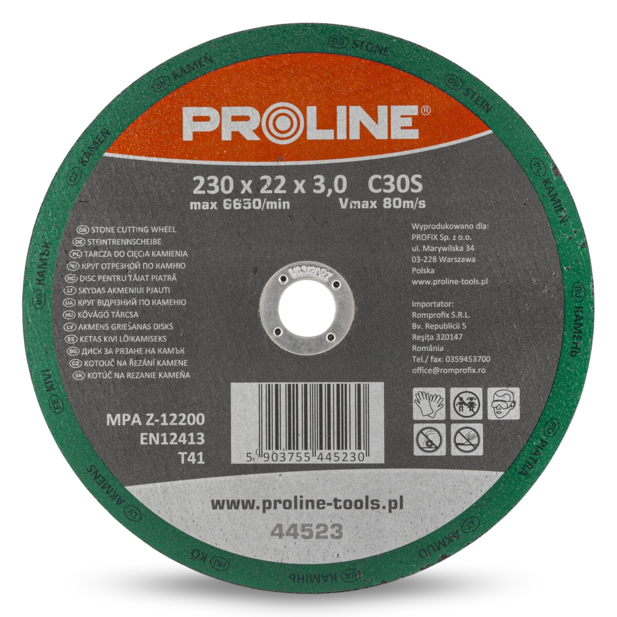 Profesjonalna tarcza do cięcia kamienia PROLINE o średnicy 230 mm i grubości 3,0 mm, przeznaczona do obróbki różnego rodzaju materiałów mineralnych. Dzięki zastosowaniu wysokiej jakości materiałów ściernych zapewnia szybkie, precyzyjne cięcie i długą żywotność.